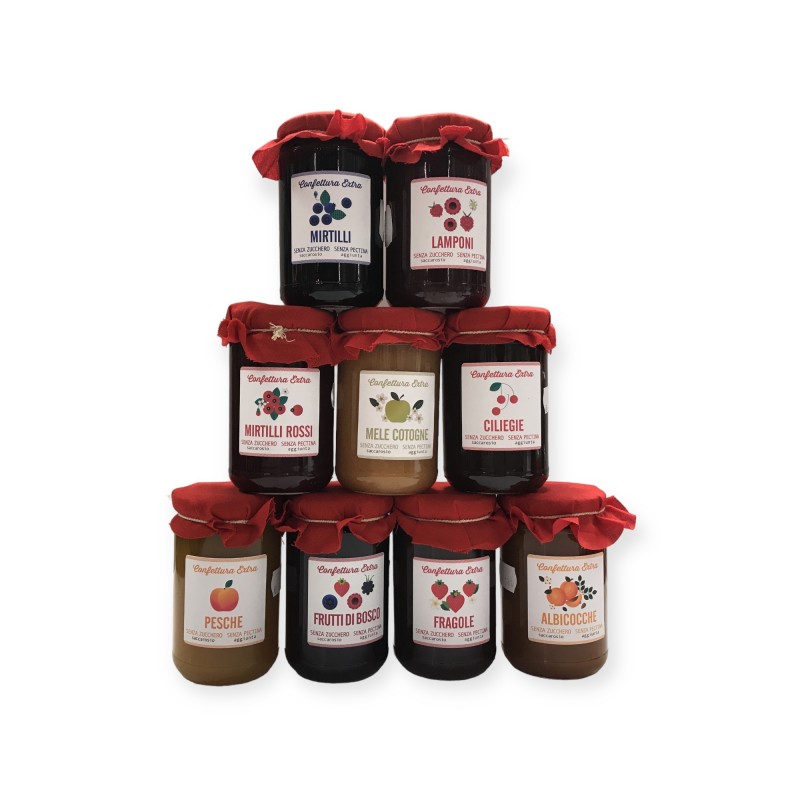 Unsere Konfitürenlinie OHNE zugesetztes PEKTIN und OHNE ZUCKER ZUCKER, ohne Pektin, das ein Verdickungsmittel ist, verwendet viel mehr Frucht und ist maximal konzentriert, aber auf diese Weise können wir uns rühmen, ein wirklich natürliches Produkt anzubieten (wenn auch offensichtlich höher Kosten). Dieses Ergebnis wird mit einer absolut einzigartigen und besonderen Methode erzielt, die es auch ermöglicht, durch das Arbeiten bei einer niedrigen Temperatur (45 ° -55 ° C) eine Marmelade zu erhalten, die die Eigenschaften der Frucht nahezu unverändert beibehält und gleichzeitig a Produkt mit hohem Geschmack und Aroma. Durch das Fehlen von Pektin erscheint es je nach Fruchtsorte cremig oder stückig, niemals gallertartig.