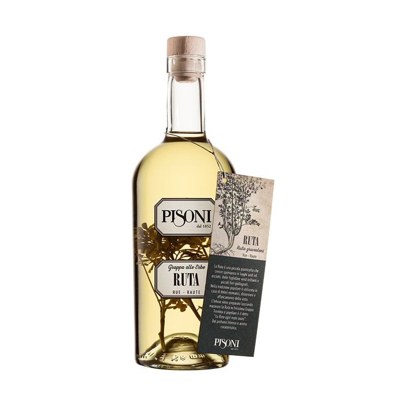 L’infuso di ruta viene preparato mettendo a macerare una pianticella di ruta in finissima Grappa Trentina Pisoni. La ruta è una pianta che trova il suo habitat naturale all’ombra degli ulivi, nella Valle dei Laghi. L’intenso profumo, l’aroma caratteristico amarognolo e le sue qualità balsamiche sono da sempre apprezzate nella tradizione popolare trentina.