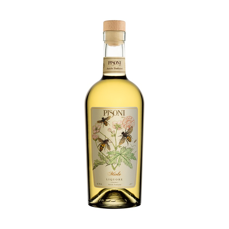 Liquore Miele Tipico liquore della tradizione alpina, ottenuto mediante infusione di miele alpino millefiori in delicata grappa trentina Pisoni. Ottimo, aggiunto al latte caldo, come rimedio contro tosse e raffreddore. Il colore è giallo chiaro, tipico del miele; il profumo è intenso ed il sapore piacevole e vellutato. Gradi: 21% vol.
